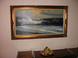 The sunset scene is an ocean view Of breakers rolling in It has an ornate golden frame But somehow fails to win I don't know where the artist was Who painted sea and sky. The light behind was fading fast. How could he dare to try? Perhaps he thought he knew it all And tried it with his hand. But he forgot what happens with The water on the sand.